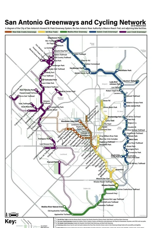 Alamo city has an abundance of trails including Leon Creek Greenway, Salado Creek Greenway and Medina Greenway. the connected trails now make up over 84 miles of trails. Find more info here